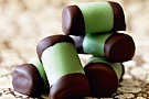 1. Mixa sönder kaksmulorna i en matberedare. Tillsätt smör, kakao och punsch och mixa snabbt ihop till en tjock smet. Fyll smeten i en spritspåse utan tyll. 2. Färga marsipanen grön med grön och gul hushållsfärg. Pudra arbetsbänken med lite potatismjöl och kavla ut marsipanen till en rektangel, ca 35 x 45 cm och ca 2 mm tjock. 3. Skär marsipanen i tre långa remsor, ca 10 cm breda. Spritsa fyllningen i långa strängar på marsipanen. 4. Vira marsipanen runt fyllningen, tryck till skarven. Skär rullarna i bitar, ca 5 cm långa. Låt dammsugarna stå i kylskåpet ca 30 min.5. Smält chokladen i mikrovågsugn eller över vatten-bad. Doppa dammsugarnas ändar i chokladen. Lägg dem på bakplåtspapper och låt stelna i kylskåpet. Förvara kallt.
