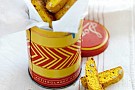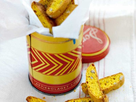 5. Grädda mitt i ugnen 15-20 min. Låt svalna på plåten. Skär längderna i 2 cm breda snitt. Lägg dem med snittytan uppåt på plåten.
