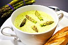 4. Smaka av med salt och peppar. Servera i soppskålar med sparrisknopparna som garnityr.