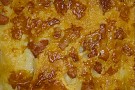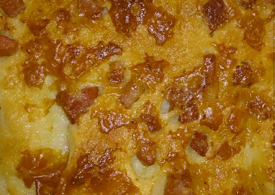 Smörj en långpanna med smör. stek fläsket i tärningar, ta upp och låt rinna av, lägg i långpannan. Vispa samman mjöl, salt, bakpulver och mjölk till en slät smet. Låt svälla en timme.