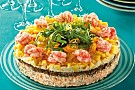 4. Bred en blandning av crème fraiche och mango chutney över tårtan. Skala och tärna mangon. Kärna ur och skiva chilifrukten mycket fint och blanda i mangon. Bred över tårtan. Garnera med skalade räkor runt kanten. Lägg ruccolasallat och skivade kumquats i mitten.