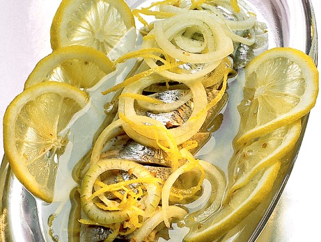 3. Skär sillen i bitar, slå på lite av lagen och garnera med fräscha lökringar och tunna citronskivor.