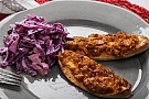 4. Strimla rödkålen fint. Lägg i en bunke och häll över kokande vatten. Låt stå ett par minuter och häll av vattnet. Kyl kålen en stund. Skala och skär äpplet i små bitar och blanda kål, äpple med majonnäs, crème fraiche, vinäger, salt och peppar.
