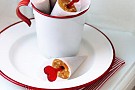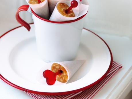 1. Smula sönder mandeln lite. Forma små strutar av vitt bakplåtspapper. Fäst ihop med häftklamrar eller tejp. Ställ strutarna i glas.