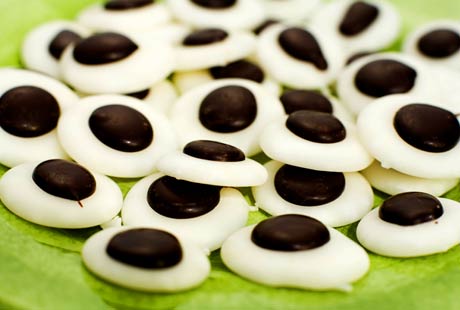 4. Smält chokladen i en skål ovanför ett vattenbad. Gör små klickar i mitten på varje sockerplatta. Låt stelna.