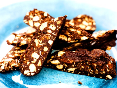 2. Hacka chokladen och blanda med nöt-mandel-sockerblandningen i en mixer. Mixa någon minut. Häll massan i en form med plastfilm i botten. Kyl den och skär sedan i bitar.