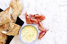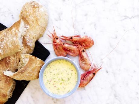 4. Ställ in en plåt i bottnen av ugnen. Släng in 1/2 dl vatten på plåten och sätt in brödet mitt i ugnen. Grädda ca 15 min. Servera dem nygräddade till skaldjuren.