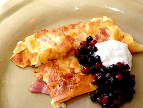 6. Häll smeten i en långpanna och grädda i mitten av ugnen i ca 20–25 minuter tills pannkakan stannat och fått fin färg.