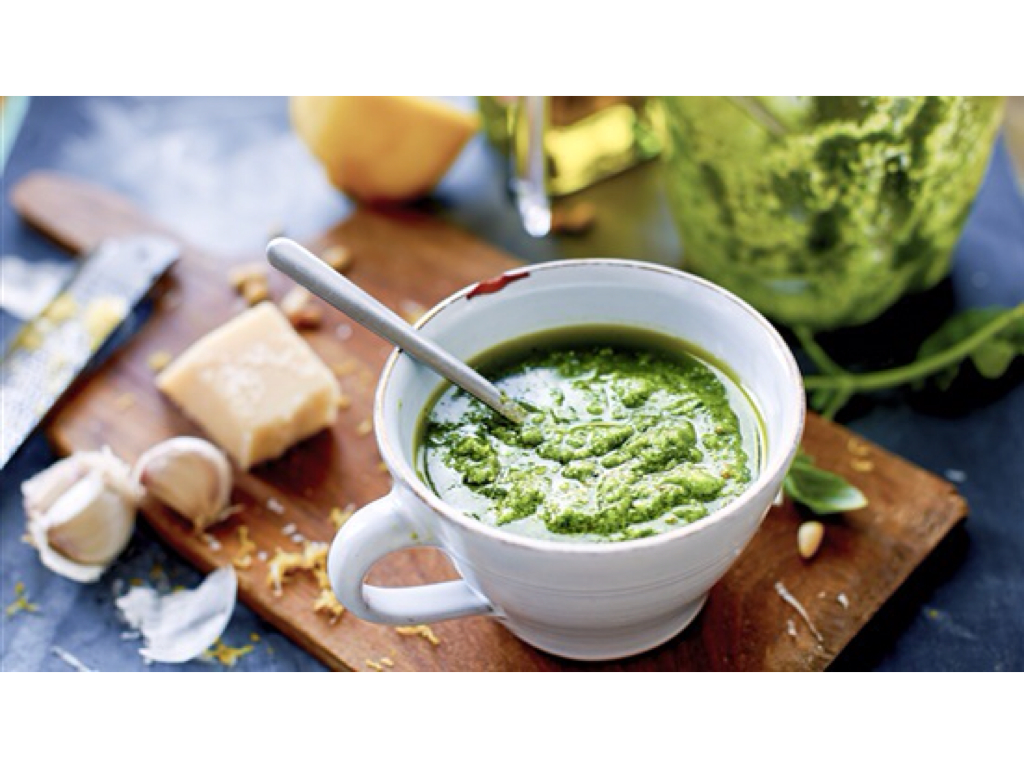 Rosta pinjekärnorna i en torr stekpanna och mixa dem tillsammans med plockade basilikablad, vitlök och olivolja. Vänd ned parmesanosten och smaka av med salt och peppar.