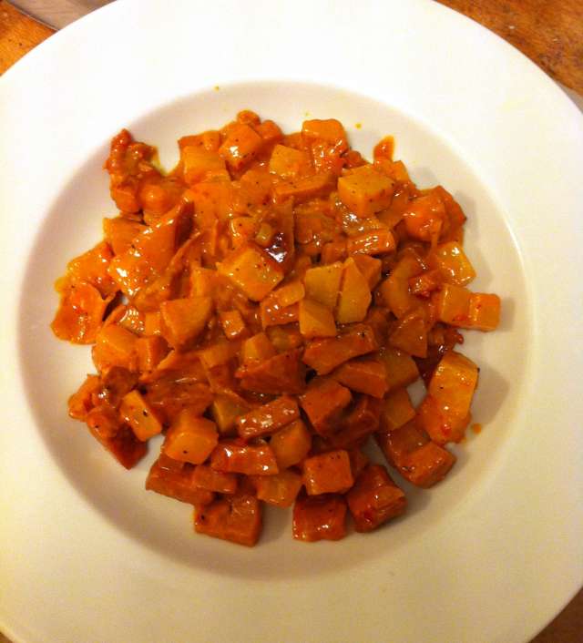 Hade lite kålrot kvar efter ett annat recept och då hittades denna rätt på. Blev jättegott! Använd gärna en korv med hög kötthalt. Kan tänka mig att några bitar lite starkare korv i kan bli riktigt gott, typ en ölkorv eller chorizo.