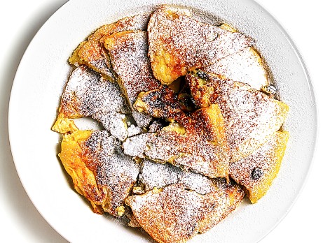 3. Grädda den andra pannkakan på samma sätt. Dela den i bitar och lägg de andra pannkaksbitarna ovanpå. Hetta upp alltsammans. Lägg upp bitarna på ett varmt fat. Pudra över florsocker.