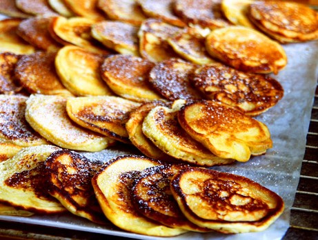 9. Pensla ett plättlagg eller en stekpanna med lite matfett och klicka ut ca ½ dl smet per pannkaka. Använder du dig av en stekpanna kan du breda ut smeten lite så att du får en rund liten pannkaka som är ca fem centimeter i diameter.