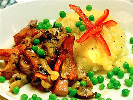 3. Lägg upp moset på varma tallrikar. Toppa med korvblandningen.