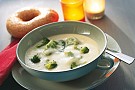 4. Mixa soppan med mixerstav. Tillsätt grädden och resterande kryddor samt de förkokta broccolibuketterna. Låt soppan få ett uppkok så att den är riktigt varm när den serveras. Vill man ha den tunnare, späd med lite vatten.