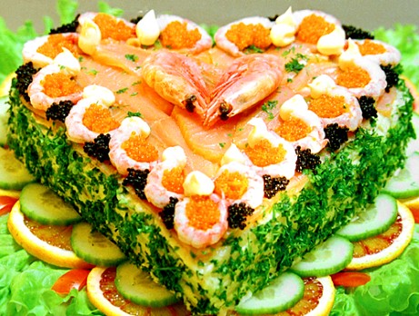 4. Hacka persiljan fint. Skär gurkan i skivor och halvera dem. Skiva citronen. Lägg sallatsbladen som en bädd på ett serveringsfat. Placera tårtan ovanpå och lägg citron- och gurkskivor runt om. Lägg den skivade laxen på tårtan, lägg på räkorna och klicka på rommen. Toppa med klickar av majonnäs. Klappa in kanten med persilja.