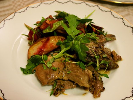 9. Ringla sedan över en dressing gjord på olivolja och reducerad balsamvinäger (2 dl balsamvinäger av lagrad sort, 1 dl rödvin och 2 msk honung) koka detta under tillsyn tills det blir en trögflytande vätska).