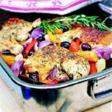 2. Strö över oliverna och hela vitlöksklyftor. Smula över salt och peppra rätt rejält. Strö över torkad timjan och rosmarin. Häll på vinet och avsluta genom att ringla över lite olja. Sätt in i 200 grader 50–60 minuter. Sänk eventuellt värmen mot slutet.