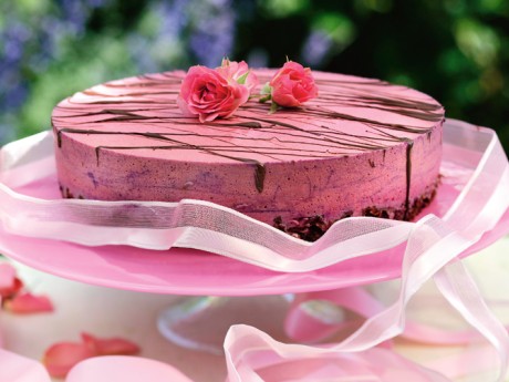 Skär med en mjuk tunn, varm kniv längs kanten och lyft försiktigt av formen. Smält chokladen i mikrovågsugn eller över vattenbad. Häll i en liten smörpappersstrut, klipp ett litet hål och spritsa mönster över moussen. Fryst tårta kan garneras direkt när den tas ur frysen. Lyft tårtan från papperet och botten med hjälp av flera stekspadar till ett tårtfat.