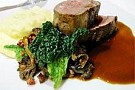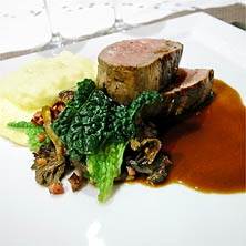 Örtstekt kalvfilé med potatis- och tryffelcremé, sallad på kål, kantareller och sidfläsk