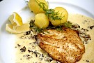 6. Servera med murkelsåsen, kokt potatis, citron och dill.
