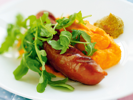 4. Servera korv och rotfruktspuré med rucola och senap.