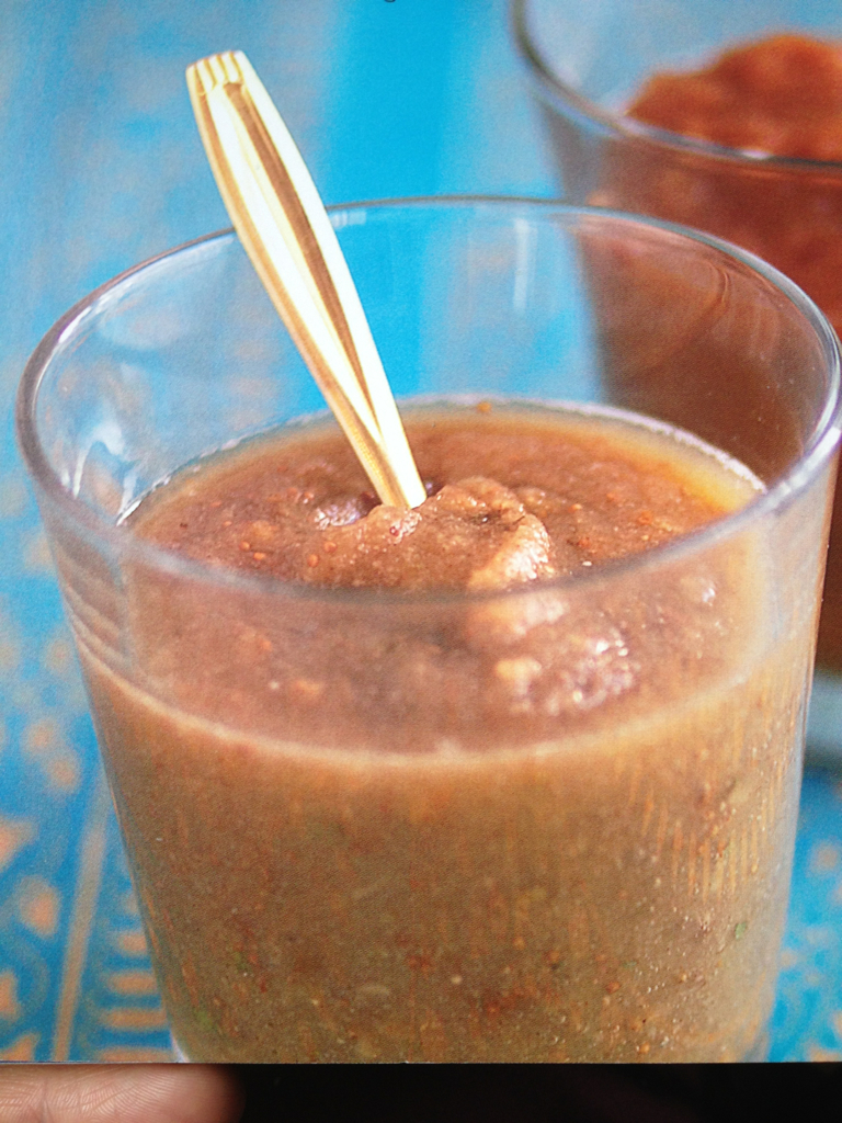 Mixa, päron, fikon, och vattnet som fikonen blötlagdes i. Mixa tills det liknar klumpig äppelsylt.