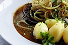 5. Häll skyn över biffarna, lägg på den stekta löken och strö över hackad persilja. Kokt potatis, helst mjölig så att du kan mosa den i den goda skyn, är gott till.
