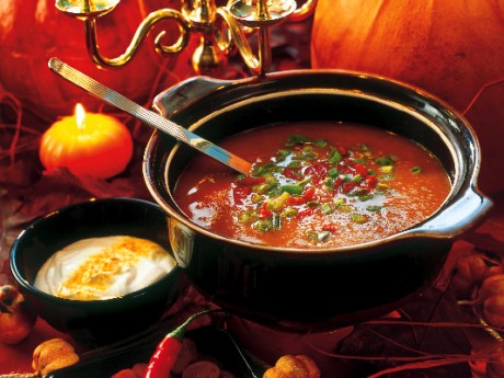 4. Strö över hackade salladslökar och finstrimlad spansk peppar på soppan.