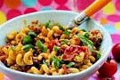1. Koka makaronerna enligt anvisningar på förpackningen. 2. Hacka lök och vitlök. Fräs i oljan några minuter och tillsätt nötfärsen. 3. Salta och peppra när färsen är genomstekt och tillsätt chili, kryddor och cocktailtomater. Låt puttra 5 minuter och tillsätt grädde, bönor och ost. 4. Koka några minuter till och häll sedan i de kokta, varma makaronerna. Rör runt och dra bort från värmen. Låt stå några minuter så makaronerna får smak av såsen. Recept: Mia Troberg Elonq