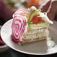 Smörgåstårta med rökt lax, avokado och hyvlad fänkål
