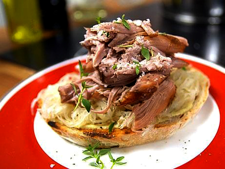 den sedan i ugnen i ca 6 timmar. Bryt bitar av karrén vid servering (det heter pulled pork för att man kan dra isär köttet för att det är så mört). Värm surkål i kastrull och gör smörgåsar av surkål och pulled pork.