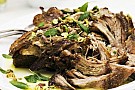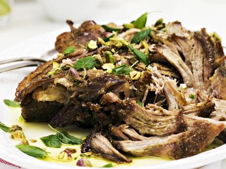 5. Grovhacka pistaschnötterna och grovplocka myntan. Strössla lite av det över köttet och servera resten som tillbehör.