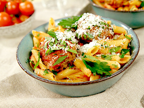 Servera pastan med köttbullarna vid sidan om, häll tomatsås på pastan och strö över lite parmesanost.