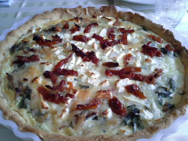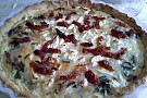 Smula över feta och fördela ut soltorkad tomat över pajen.