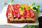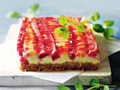 3. Ansa rabarbern, halvera stängerna på längden om de är grova. Lägg rabarbern i en gryta och strö över sockret. Låt koka på svag värme tills rabarbern mjuknat. Låt den rinna av och lägg den sedan på hushållspapper så att saften försvinner. Lägg rabarberstängerna på den nygräddade kakan. Låt kakan kallna. 4. Smält gelén och pensla på kakan. Skär bitar och garnera med mynta.