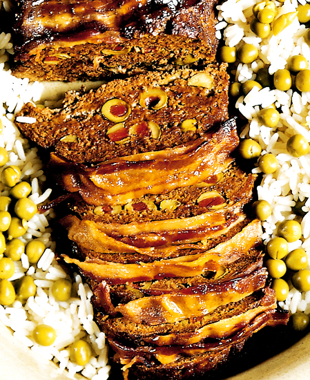 Blanda färsen med hackade oliver, salt, peppar och tomatpuré. Lös upp buljongtärningen i det uppvärmda vattnet. Låt svalna och rör ner ströbröd och ägg. Låt svälla 5 minuter. Blanda ströbrödet med färsen. Provstek gärna en klick för att kolla kryddningen. Forma en limpa i en lättsmord ugnsform. Täck med baconskivor och stek i nedre halvan av ugnen ca 1 timme.