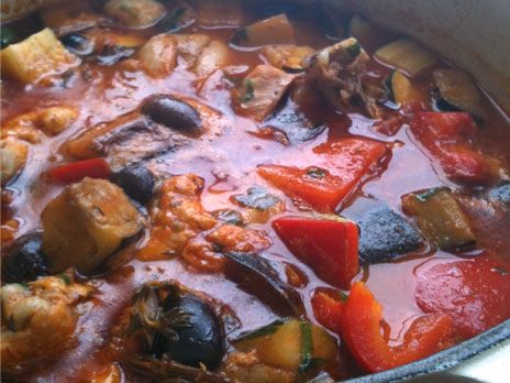 Bryn kycklingbenen i olja tills de fått fin färg runt om. Lägg i lök och vitlök och bryn ytterligare någon minut. Häll i vitt vin, tomater, vatten och timjan. Låt koka under lock ca 30 minuter. Bryn zucchini, aubergine och paprika i lite olja och lägg ner i grytan. Låt koka ytterligare 10 minuter. Lägg i oliver och smaka av med salt, peppar och en nypa socker. Avsluta med hackad persilja. Servera med nykokt pasta eller ris.
