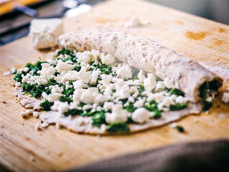 Värm ugnen på 200°. Låt spenaten tina i ett durkslag. Pressa ut vätskan ur spenaten och lägg i en skål tillsammans med olivolja, salt och peppar och blanda. Kavla ut degen tunt, som till kanelbullar, cirka 40 x 50 cm. Lägg på spenaten och smula över fetaosten jämt. Lämna en orörd degkant överst där degen ska fästa så att rullen håller ihop.