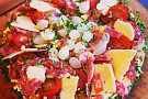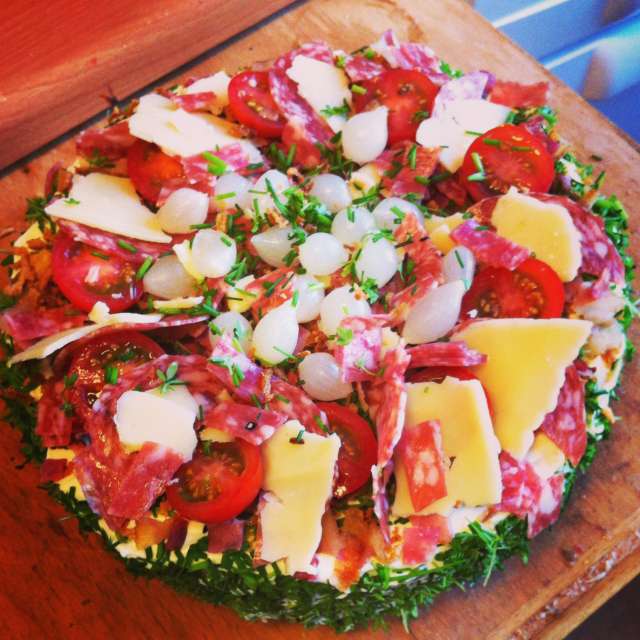 Strö blandningen av krasse/gräslök över sidorna och toppen. Strö rostad lök, syltlök och bacon över toppen. Halvera tomater och salami och lägger med ostskivor. Klart!
