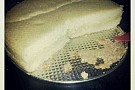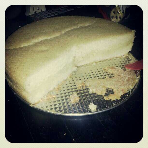 Dela kakan när den är varm på mitten, häll på fyllningen på båda delarna jämt fördelat. Slå i hop igen och ställ kallt för att safta till sig.