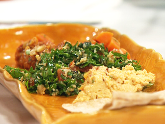Hacka bladpersiljan en gång. Blötlägg borgholen i vatten och låt stå. Övriga grönsaker hackas fint och allt blandas med borgholen, citronsaft, kryddor och olivolja.