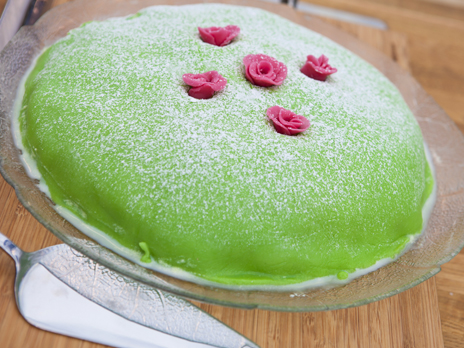 Färga och kavla ut marsipanlocket. Lägg locket på tårtan och skär till kanterna. Pudra tårtan med florsocker. Färga rosa marsipan och gör rosor. Placera dessa på tårtan.