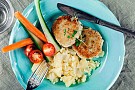 2. Fiskbiffar: Kolla så att det inte är några ben i fisken. Lägg fisken i en matberedare tillsammans med salt, peppar, örtkryddor, potatismjöl och citronsaft. Mixa ihop och tillsätt grädden i en tunn stråle lite i taget. Forma 8 st biffar med vattensköljda händer.