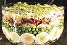 1. Strimla salladen. Lägg hälften av salladen i en stor skål. Täck med äggskivor och ställ gärna några runt kanten. Salta lätt. Täck med ärter och resten av salladen.