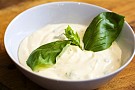 3. Tillsätt oljan droppvis under vispning med elvisp. Smaksätt med basilika.