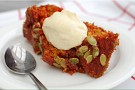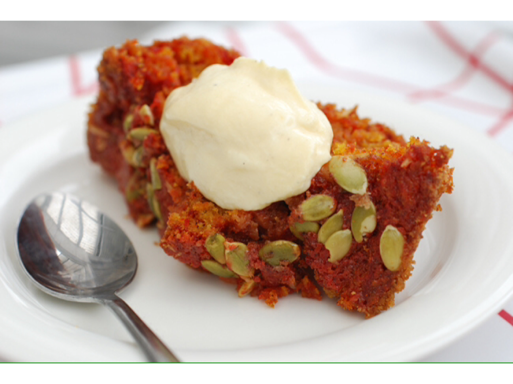 Smörj och bröa en form, ca 24 cm (jag bröade med en blandning av rostad kokos och ströbröd). Sätt ugnen på 175 grader. Kärna ur äpplena och skär dem i tärningar eller klyftor. Blanda socker och kanel i en bunke. Vänd runt äppelbitarna och ta sedan upp dem och lägg åt sidan. Tillsätt smör i bunken och rör det pösigt. Rör ner äggen ett i taget. Skala och finriv rödbetorna och blanda ner i smeten. Blanda mjöl och bakpulver och rör ner det i smeten. Häll smeten i formen. Stick ner äpplena i smeten och strö över pumpafrön. Grädda i mitten av ugnen ca 40 min. Servera med kesella vanilj.