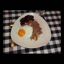 Stek löken i stor stekpanna. Fortsätt med potatisen sedan. Rör om. Finfördela pölsan i pannan och krydda. Värm upp. I annan stekpanna steker du äggen. Ej vändstekta.Lägg upp på tallrikarna med ägg överst. Rödbetor till. Öl eller en flaska Bourgogne blir nog bra till.