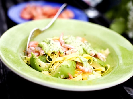 3. Häll av vattnet och blanda i räkorna och avokadon. Smaksätt med salt och peppar samt ringla över lite olivolja.
