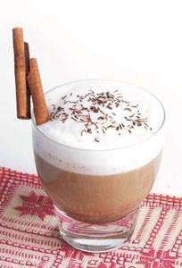 Värm och skumma mjölken och häll i glaset. Brygg espresso med övriga ingredienser. Häll sedan blandningen sakta i glaset över mjölken. Dekorera gärna med kanelstång och eventuellt en liten nypa te.