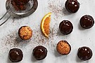 Apelsintryffel: Lägg chokladen i en bunke. Blanda socker och äggula i en skål. Koka upp grädde och apelsinsaft och slå det över äggulorna, blanda runt och häll tillbaka allt i kastrullen. Värm blandningen under omrörning till det börjar sjuda utan att koka och slå det över chokladen. Låt stå i någon min. Klicka i smör och mixa eller vispa till en slät smet.